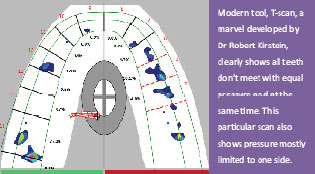 This in turn ensures no abnormal forces on the disc- a much softer tissue comparatively. This ensures no tearing, stretching or pulling forces on disc. If present that disadheres/tears away, the disc fromadjacent tissues and this slimy tissue slides either forward as in loss of vertical dimension on one side cases towards inside- into a “sanctum sanctorum”- an area loosely defined as infra temporal fossa or area behind it. This is a zone where a large number of nerves and blood vessels of brain exist – almost 16 structures. I published this in detail some years ago in Famdent- a leading Dental journal. This can be clearly seen on a Kinematic MRI, or observed on a BioJVA.(some tools)